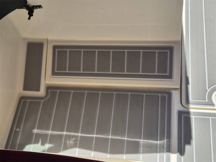 The EVA floor is 1/4″(6mm) thick two-color pad. You can choose your colors, texture and faux teak option. Additional custom text logos can also be incorporated on EVA floor. All routed logos and beveled edges will show the bottom color selected. All EVA floors come with marine backing glue. All EVA floors listed on our online store are “made to order” and not stocked so please allow up to 2-3 weeks for delivery.