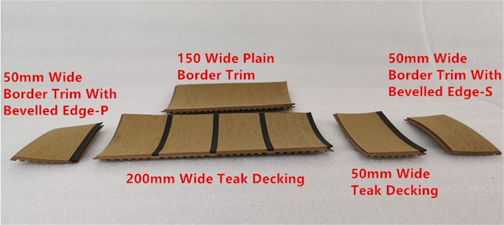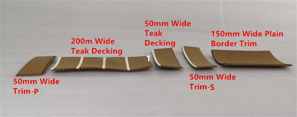 150mm (6 inch) Wide Plain Border Trim: It is 150mm(6 inch) wide, 5mm(0.2 inch) thick and 25 meters(82 feet) long per roll. It can only be used for the 200mm or 50mm wide teak decking’s border trim.